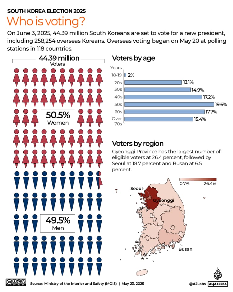 🗳️ South Koreans head to the polls on June 3 in a high-stakes snap election after ex-President Yoon Suk-yeol’s brief martial law stunt triggered impeachment and chaos. Frontrunner Lee Jae-myung is leading the race against conservative Kim Moon-soo, with big implications for Seoul’s democracy, economy, and ties with the US, China, and North Korea.